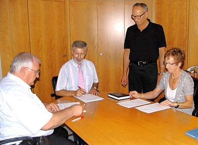 Download Jugentaxischein als PDF zum ausdrucken | Unter den Augen von Referent Ernst Wißmann unterzeichneten Landrat Axel Redmer, Peter Allmang von der Taxi-Allmang GmbH und Hannelore Petry vom Taxen-Dienst Baumholder den Beförderungsvertrag für das Jugendtaxi. |